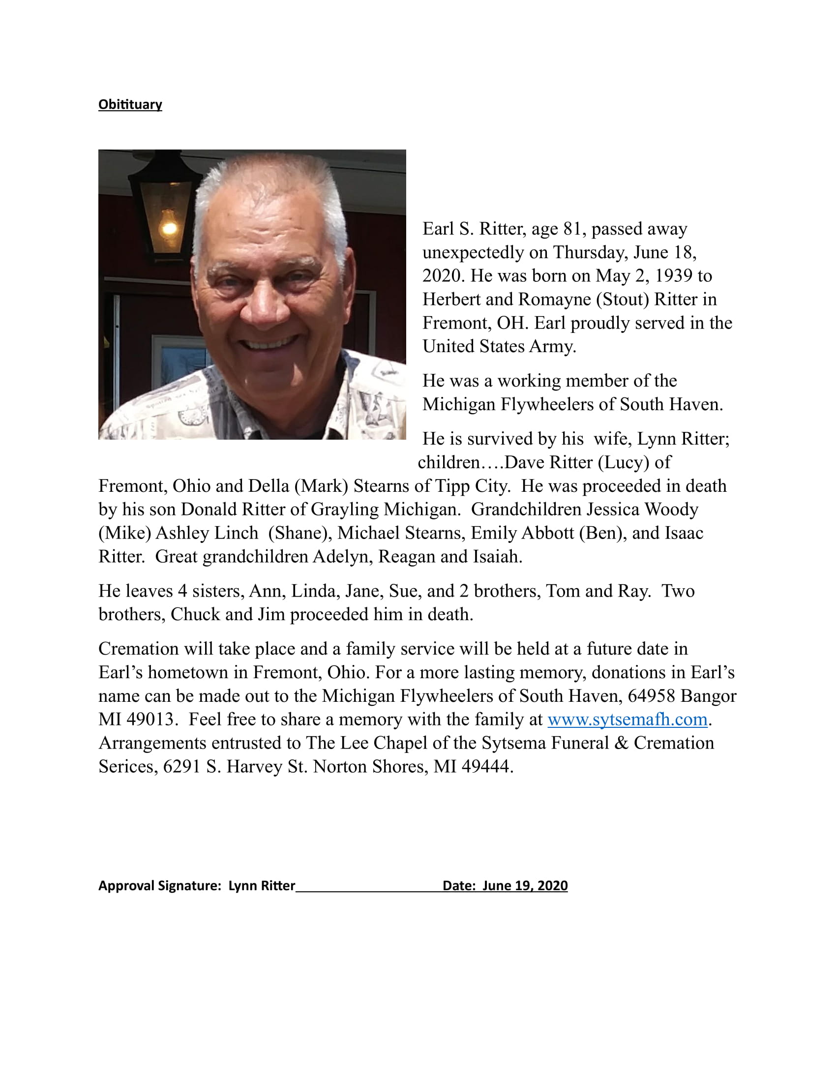 Earl Ritter, age 81, passed away unexpectedly on Thursday, June 18, 2020. He was born on May 2, 1939 to Herbert and Romayne (Stout) Ritter in Fremont, OH. Earl proudly served in the United States Army. He was a working member of t